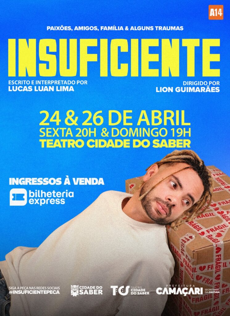 Mergulhando nas complexidades das relações humanas, da memória, do autoconhecimento e do abandono afetivo, o espetáculo “Insuficiente” estreia no Teatro Cidade do Saber (TCS), com apresentações nos dias 24 e 26 de abril, às 20h e às 19h, respectivamente. O monólogo interativo é o mais novo trabalho autoral do camaçariense Lucas Luan Lima, e transita entre o drama e o humor.