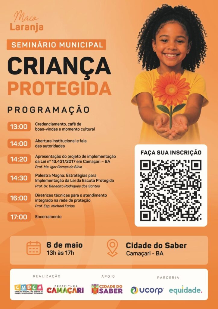 Os interessados em participar devem realizar a inscrição até o dia 5 de maio, de forma on-line, através deste link [https://escutaespecializada.com.br/seminario-municipal-crianca-protegida-camacari-ba/].